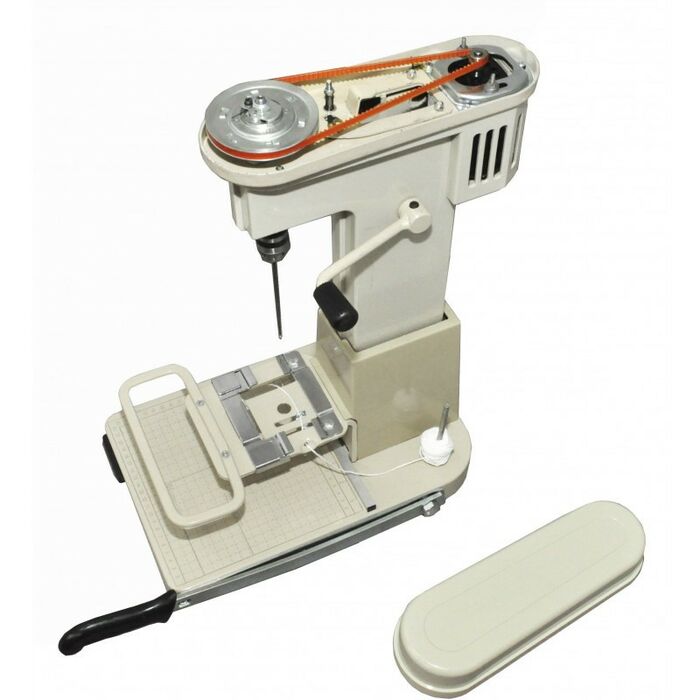 • для удобства работы имеется съемный лоток для переплетаемых документов, в который укладывается необходимое количество листов бумаги (толщина прошивки до 100мм.), которые прижимаются планкой с двумя прижимными винтами, лоток устанавливается на станину машины;