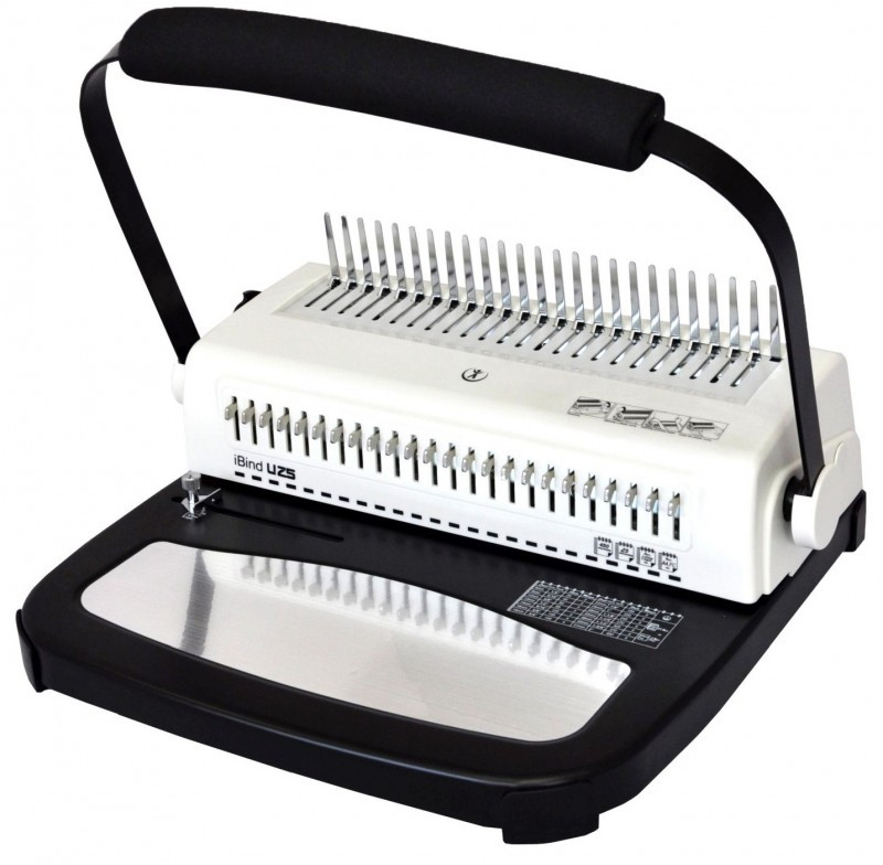 - iBind U25 – мощная переплетная машина на пластиковую пружину, пробивающая за раз 25 листов бумаги 80гр/м2 и обладающая 2 ручками для одновременной брошюровки и перфорации, с помощью которой можно переплести до 500 листов бумаги.