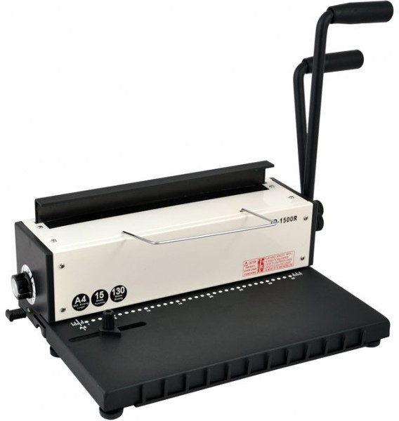 Переплетная машина на металлическую пружину с удлиненным рабочим столом. Это недорогая модель брошюратора, с помощью которой можно переплести до 120 листов, оснащена ручкой для перфорации отверстий в бумаге и отдельной ручкой для сжатия пружины. Литера «R» говорит о том, что машинка пробивает круглые отверстия, в отличии от модели TD-1500.
