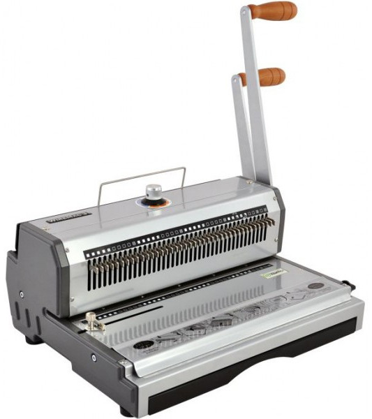 Переплетная машина на металлическую пружину. Одна из самых популярных моделей брошюраторов с функцией отключения ножей перфорации с помощью которой можно переплести до 120 листов. Машина оснащена ручкой для перфорации отверстий в бумаге и отдельной ручкой для сжатия прижины. WireMac 31 отличается современным дизайном, пробивает квадратные отверстия и имеет специальный определитель диаметра пружины. Механизм зажима у данной модели оснащен полосками с алмазным напылением для предотвращения поворота пружины во время зажатия. Подойдет для компаний, организаций и типографий со средним и большим объемом работ.