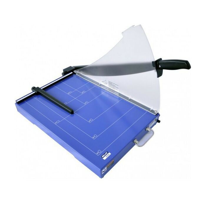 Большой металлический стол с разметкой форматов, фиксация ножа в закрытом состоянии, защитный экран, упор для бумаги (ограничительная планка), ручка для переноски. Для офисов и организаций со средним и большим объемом работ.