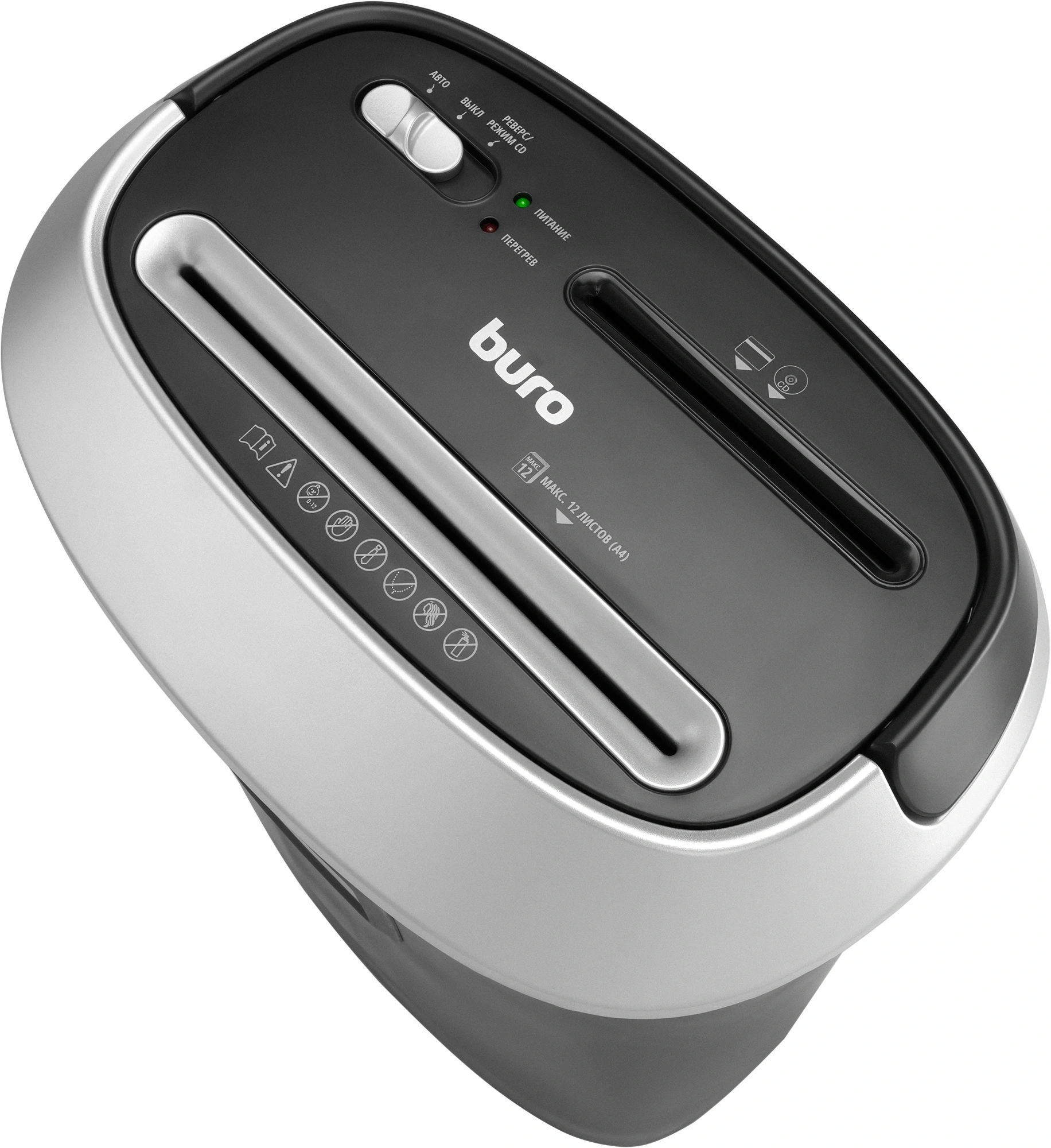 Шредер Buro Office BU-S1201 черный/серебристый с автоподачей (секр.P-4) фрагменты 12лист. 25лтр. скрепки скобы пл.карты CD