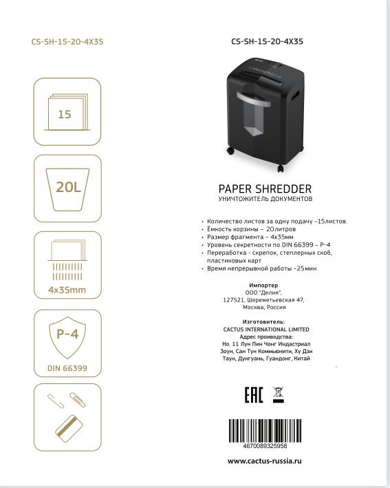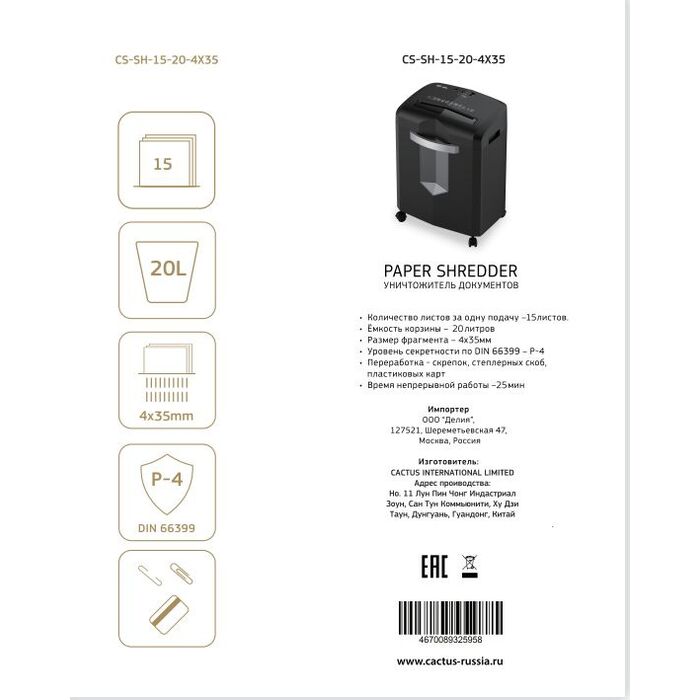 Шредер Cactus CS-SH-15-20-4X35 (секр.P-4) фрагменты 15лист. 20лтр. скрепки скобы пл.карты CD