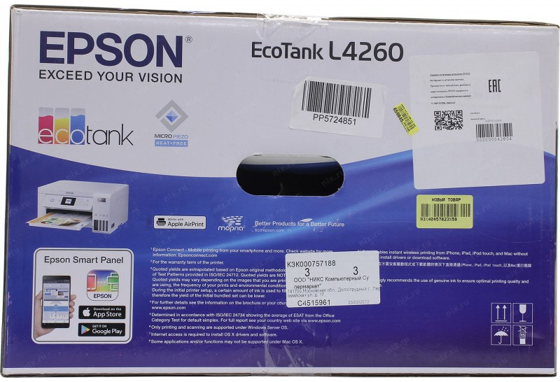 • Технологии беспроводной печати: Apple AirPrint, Epson Email Print (облачная печать), Epson iPrint, Epson Smart Panel, Mopria