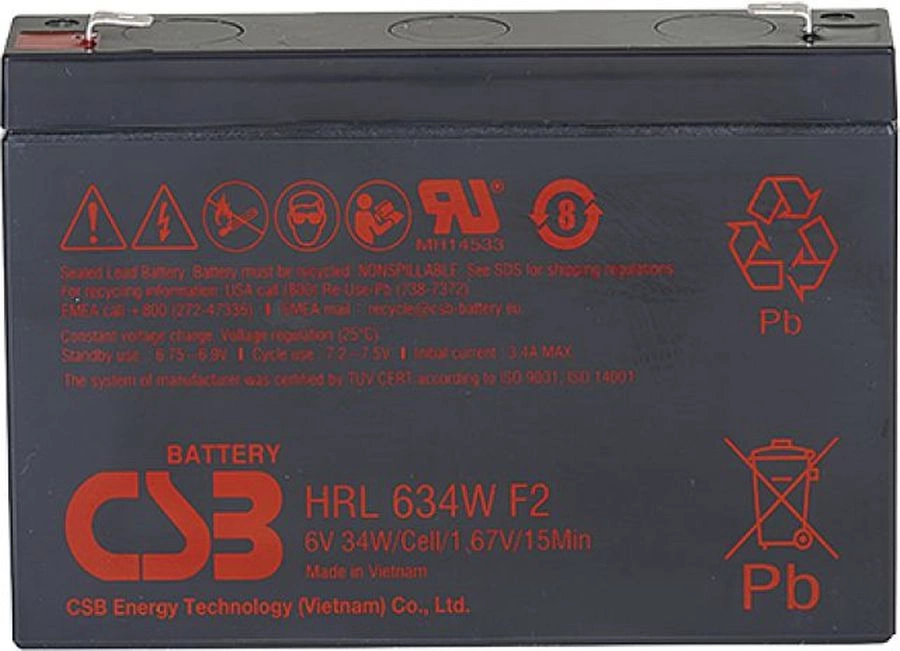 Аккумулятор CSB HRL 634W F2 FR с высокой энергоемкостью. Особенная кристаллическая решетка электродов позволила увеличить на 20% отдаваемую мощность по сравнению с батареями других серий. Она разработана для эксплуатации в режиме высоких токов разряда при коротком времени разряда.