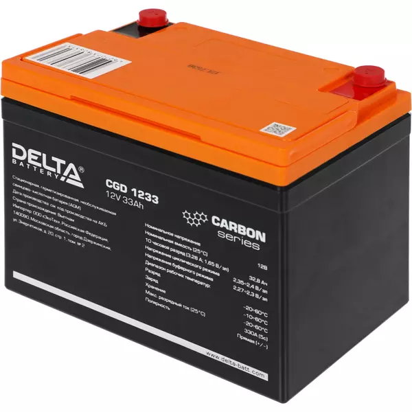 Свинцово-кислотный аккумулятор Delta линейки CGD выпускается с напряжением 12 В и ёмкостью 33 Ач. В основе лежит технология AGM, жидкий электролит удерживается внутри стекловолоконных сепараторов неподвижно.