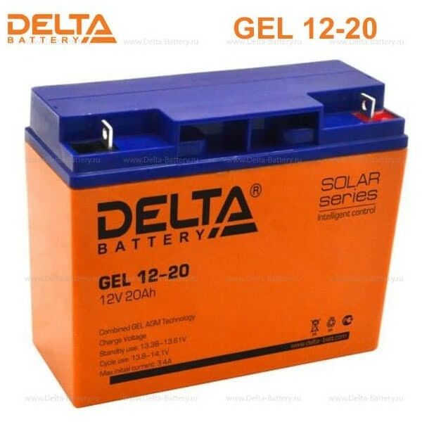 - Свинцово-кислотный аккумулятор Delta GEL 12-20 напряжением 12В и емкостью 20Ач изготовлен по технологии AGM+GEL: combined AGM and GEL technology (частичное сгущение электролита)
