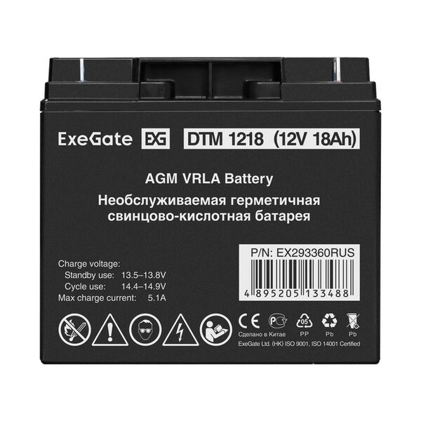 Аккумулятор Exegate DTM 1218 12V, 18Ah, клеммы F3, болт М5 с гайкой [EX293360RUS]