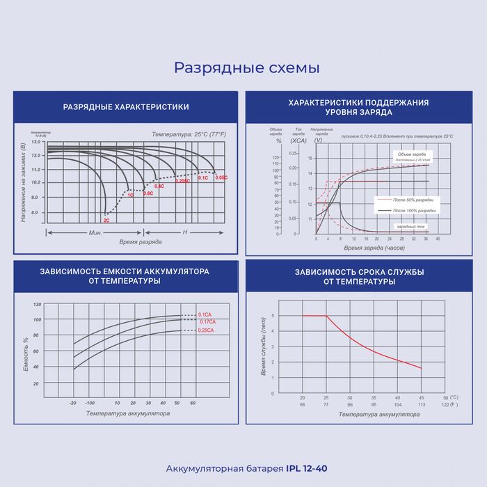 | Влияние температуры на емкость | 40 C 103%, 25 C 100%, 0 C 86% |