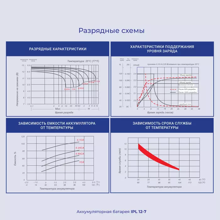 | Циклический режим | Начальный ток заряда менее 2,70 А. Напряжение 14,4 В~15,0 В при 25 C Температурный коэффициент - 20 мВ/ C |
