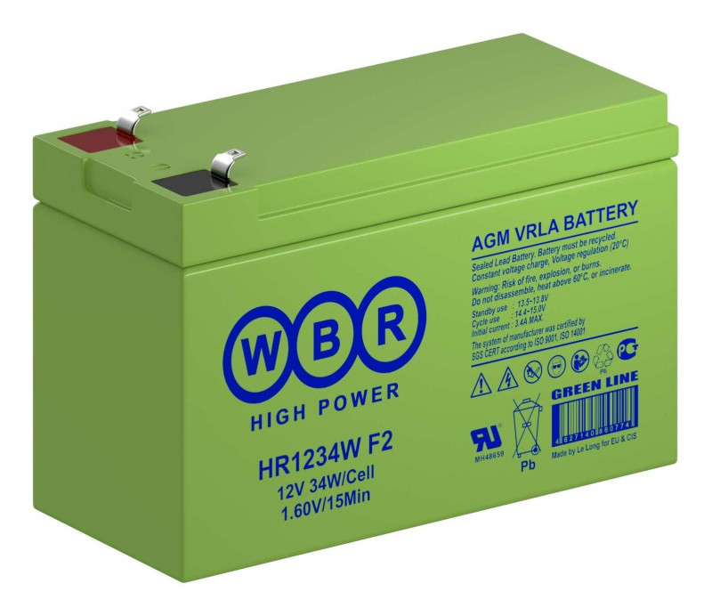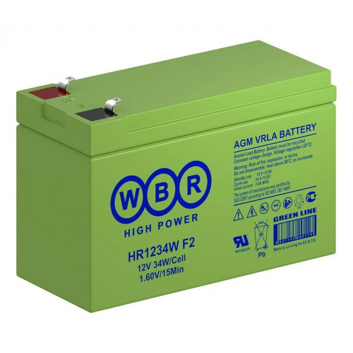 Аккумулятор WBR HR1234W - герметизированная, выполненная по технологии AGM, аккумуляторная батарея общего применения со сроком службы до 8 лет в буферном режиме или 260 циклов заряда-разряда в циклическом режиме при 100% разряде. Эта высокоэффективная, перезаряжаемая, батареи не требующая обслуживания в течение всего срока службы.