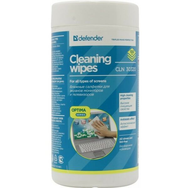 Описание Влажные чистящие салфетки Defender CLN30320 в пластиковой тубе для экранов всех типов (100шт)