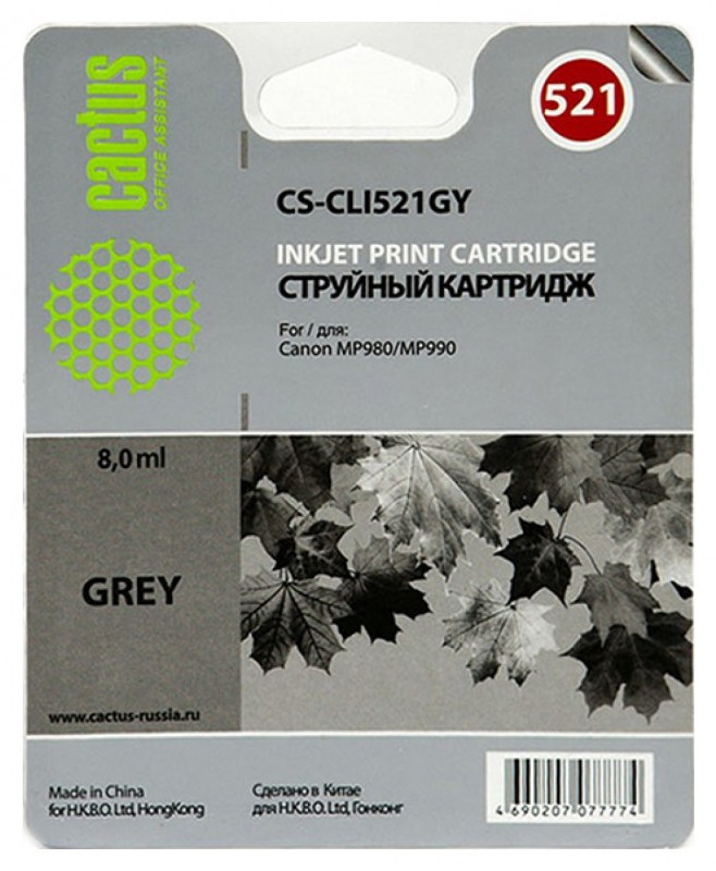 Картридж Cactus CS-CLI521GY для Canon PIXMA MP980/ MP990, серый, 1395 стр., 8.4 мл.