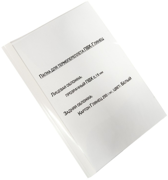 - Обложки: верх - ПВХ А4 0,15мм прозрачные, низ - картон глянец белый 250г/м2