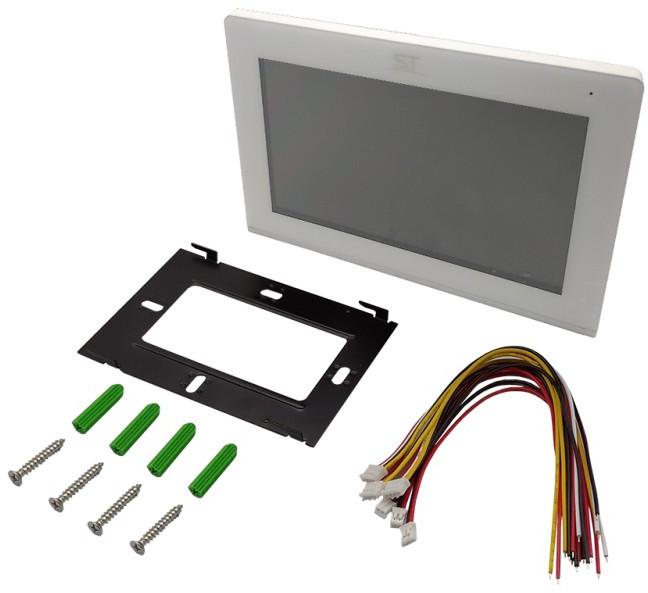 - Монитор видеодомофона с кабелем питания 220В,крепежный комплект,кронштейн для установки,соединительный кабель (4 контакта),соединительный кабель (2 контакта),паспорт,тарная упаковка