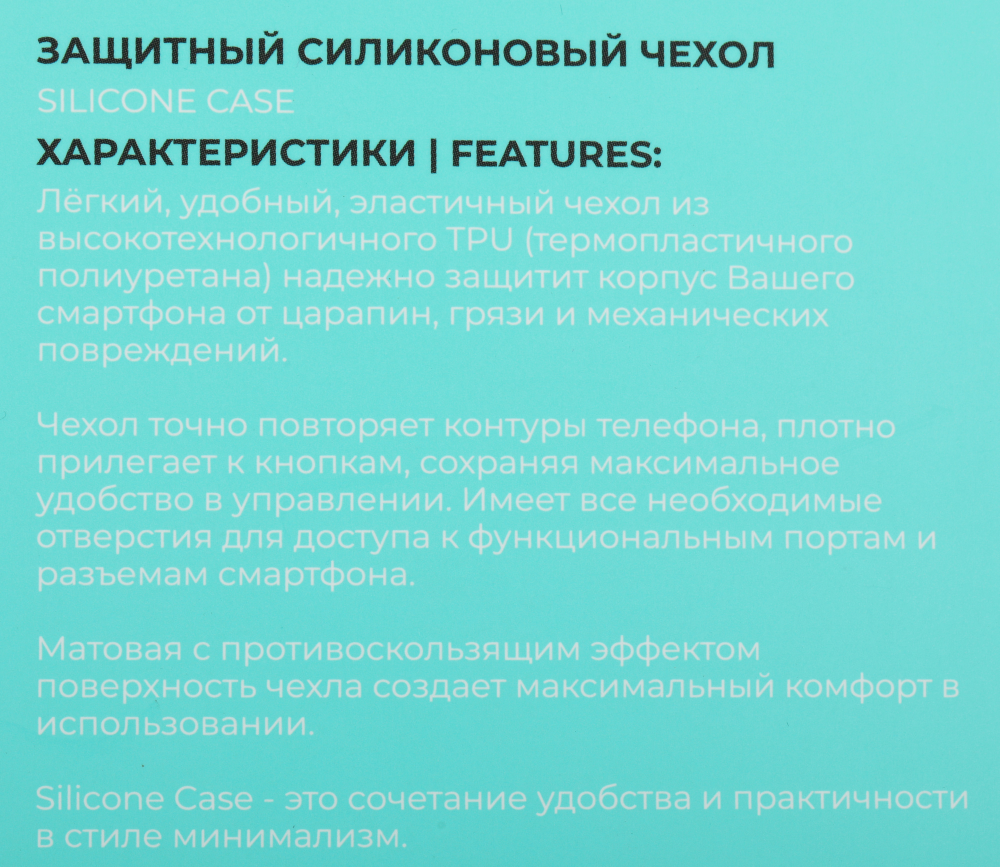 Чехол Silicone Case специально разработан с учётом всех особенностей Вашего смартфона. Благодаря толщине материала не более 0,8мм чехол минимально увеличивает размеры смартфона, при этом защищает заднюю панель от царапин, грязи и пыли, а матовая поверхность предотвращает выскальзывание из рук.