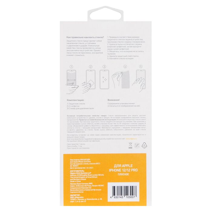 Описание Digma Защитное стекло для экрана для Apple iPhone 12/12 Pro прозрачная [DGG1AP12PA]