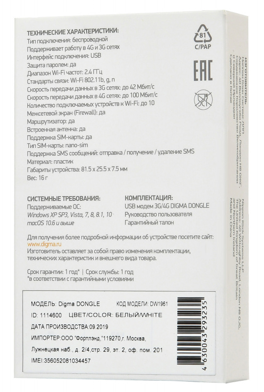 Описание Digma Dongle DW1961