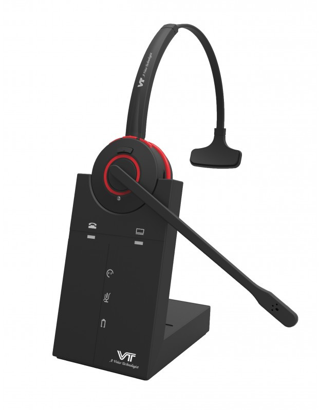 - VT9400 - беспроводная моноауральная DECT-гарнитура с HD-звуком. Базовая станция DECT совмещена с зарядным устройством. Данную гарнитурулегко можно подключить к любому телефону через аналоговый разъём RJ9 (в комплекте кабель типа 3 для подключения к телефонам Yealink, Grandstream, Snom; для подклчюения к другим телефонам необходимо приобрести соответствующий кабель-переходник) и к ПК/Ноутбуку или телефонному аппарату через USB (type-A).