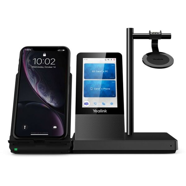 • Базовая станция гарнитуры обладает сенсорным дисплеем 4'' с разрешением 480x800 пикселей, встроенным спикерфоном, беспроводной зарядной подставкой для смартфона (опционально).