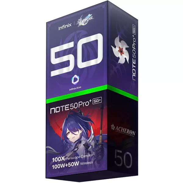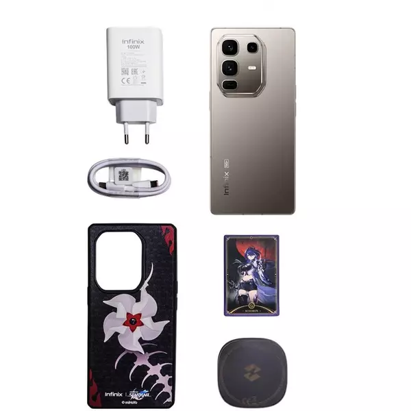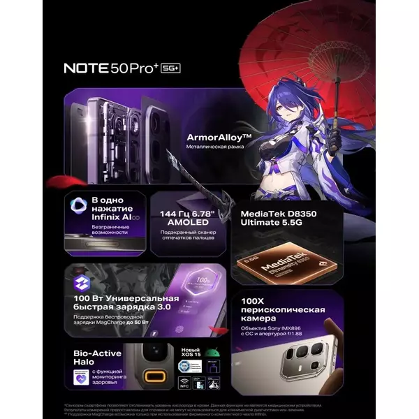 | Комплектация | Смартфон Infinix NOTE 50 Pro+ 5G+,Эксклюзивный чехол с дизайном Honkai: Star Rail, Карта Ахерон с гифт-кодом, Зарядное устройство 100 Вт + кабель для зарядки, Беспроводная панель 30 В, VIP-карта CarlCare, Защитное стекло, Документация и скрепка |