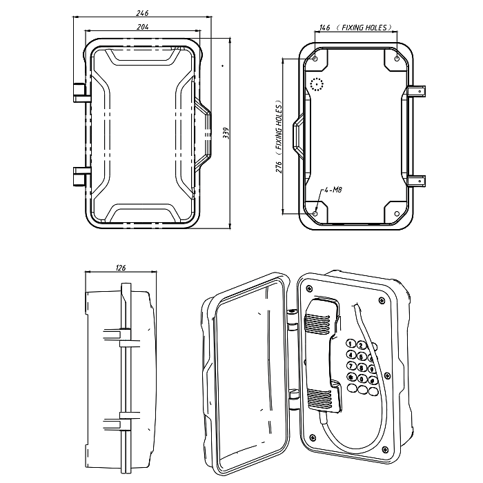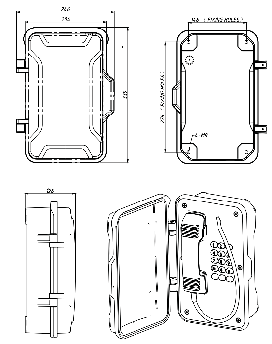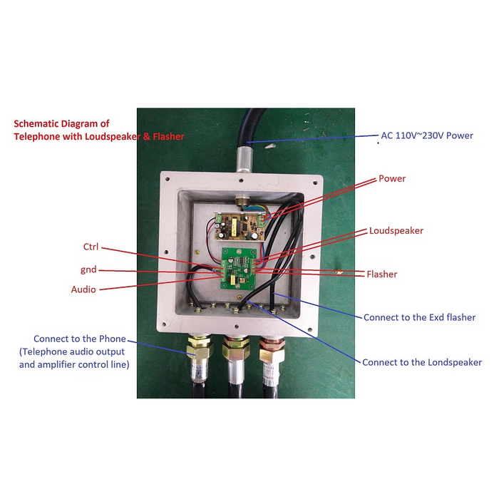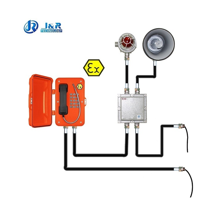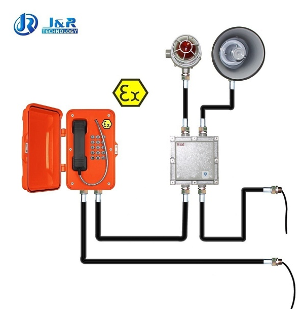 Всепогодный взрывозащищенный промышленный SIP-телефон в комплекте с взрывозащищенными горном и проблесковым маяком. Изготовлен из литого под давлением алюминия с антикоррозионным эпоксидным порошковым покрытием и имеет степень защиты от окружающей среды IP67. Рекомендован для использования в метро, горнодобывающей промышленности, тоннелях, заводах, электростанциях, железных дорогах и т. д.