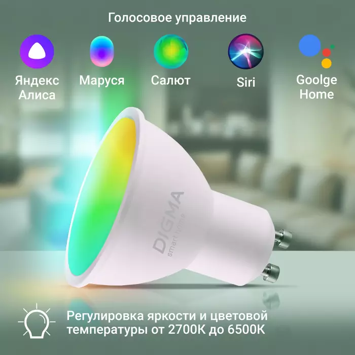| Возможности | Работает с Алисой и Марусей. Автоматизация и управление освещением через приложение Digma SmartLife. |