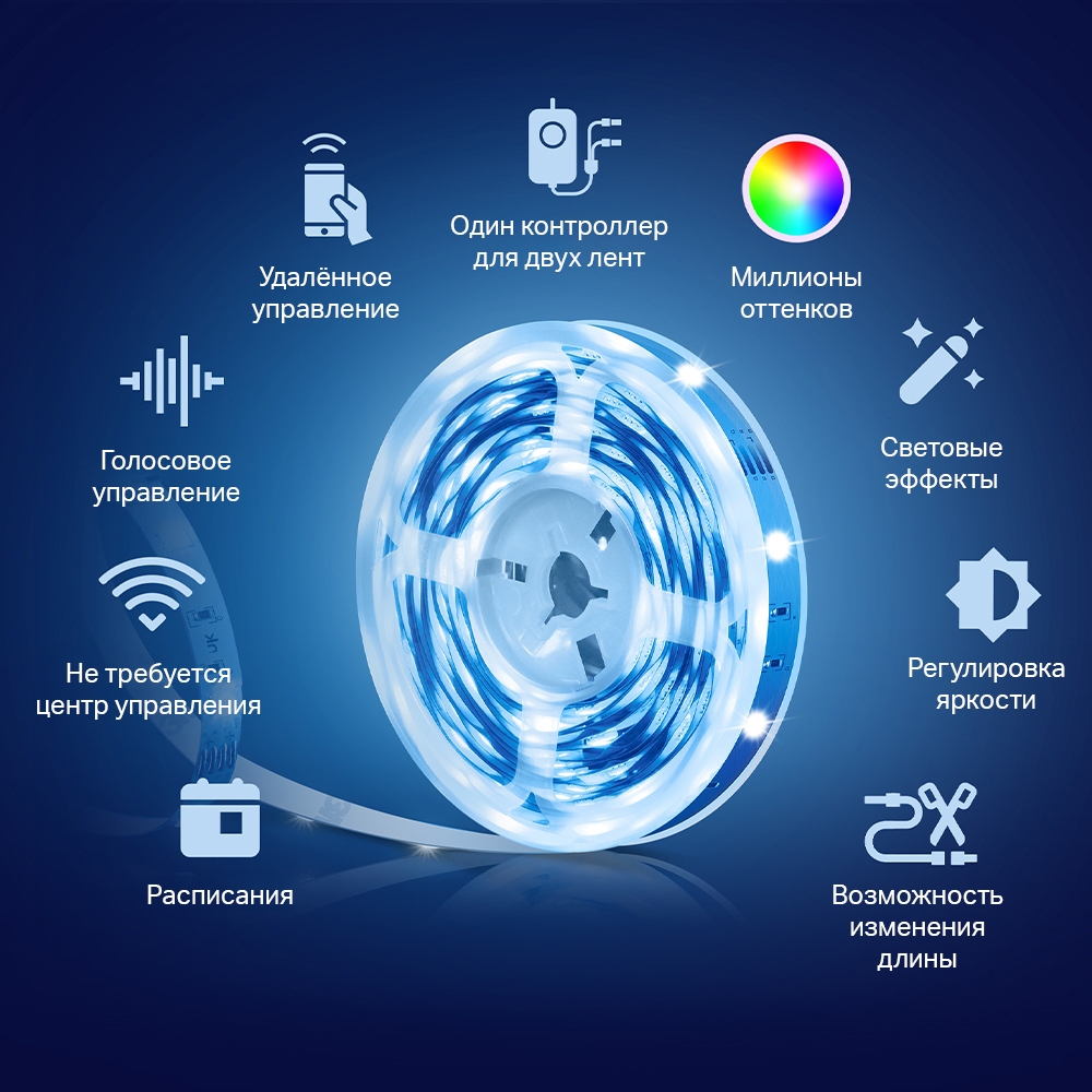 | Возможности (лампы, розетки, ленты) | Голосовое управление; Таймер; Режим «Не дома» |