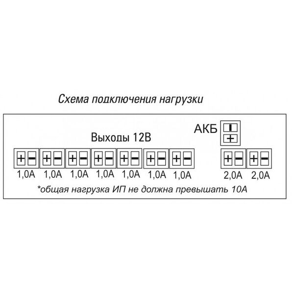 - Максимальный ток нагрузки 1 канала: 7 каналов - 1А,2 канал(№8,9) - 2A (общая нагрузка ИП не должна превышать 10А)