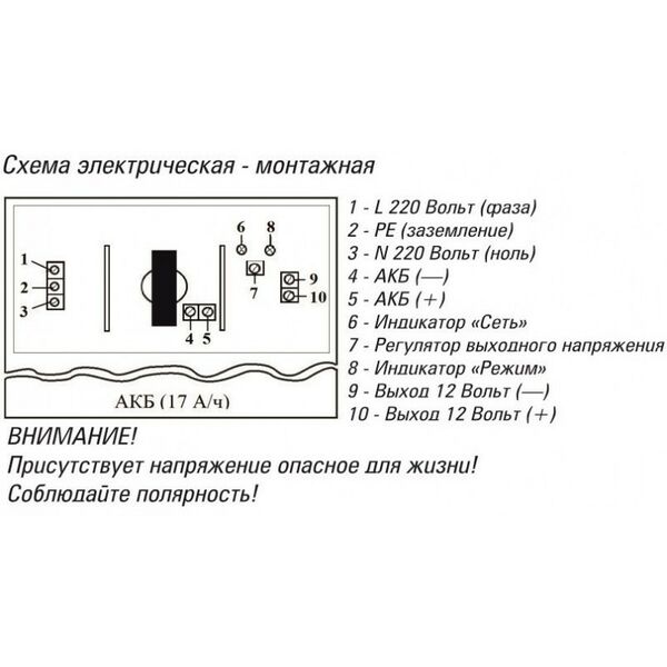- Источник питания, крепеж, кабель с двумя клеммами для подключения внешнего АКБ, переходник для подключения АКБ 17 А/ч, паспорт, коробка.