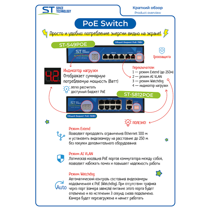 | Дополнительно | AI PoE(watchdog)/Vlan/Extend/Индикатор нагрузки |