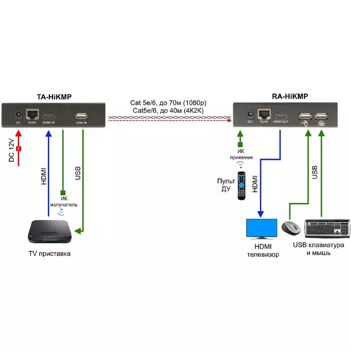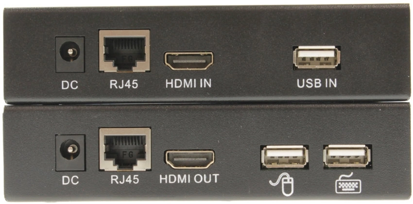 | Особенности | Комплект для передачи HDMI, USB, ИК управления и питания по кабелю витой пары (HDBaseT). Расстояние передачи до 40м (4K2K(30Гц)), до 70м (1080p). Поддержка Power over HDBaseT(PoH). Поддержка HDMI 1.4, HDCP 1.2. USB для подключения клавиатуры и мыши. |
